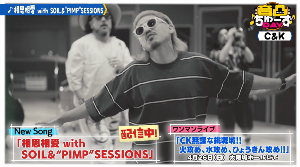 今回のゲストは、SOIL &“PIMP”SESSIONSとコラボレーションした、ジャズサウンドが心地いい新曲を配信中のヴォーカルユニットC&K。4月末には、大阪城ホールでワンマンライブ「CK無謀な挑戦城!!火攻め、水攻め、ひょうきん攻め!!」を開催する2人組です。