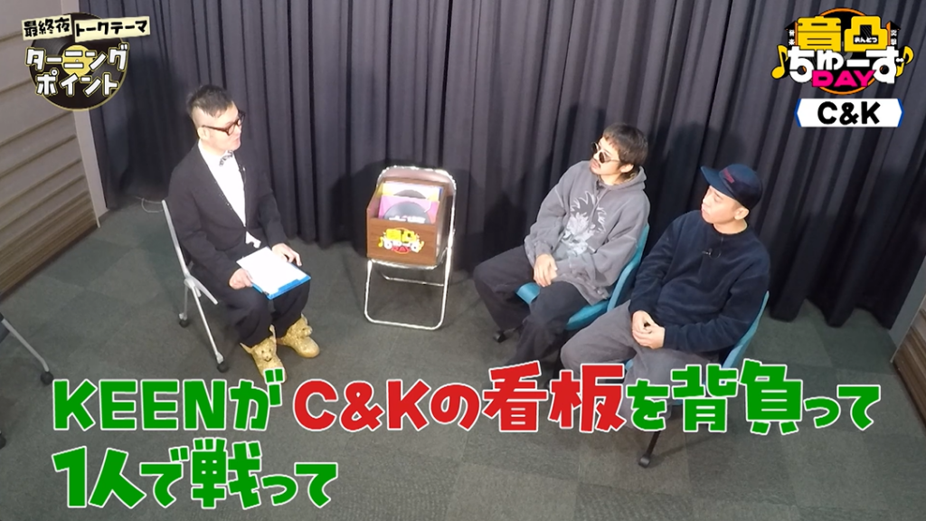 KEENは、C&Kとしてデビューする前に九州男(くすお)と出会ったことがこの世界に入るターニングポイントになったと明かします。この出会いから、C&K初の作品「1/6000000000 feat. C&K/九州男」が生まれることに。