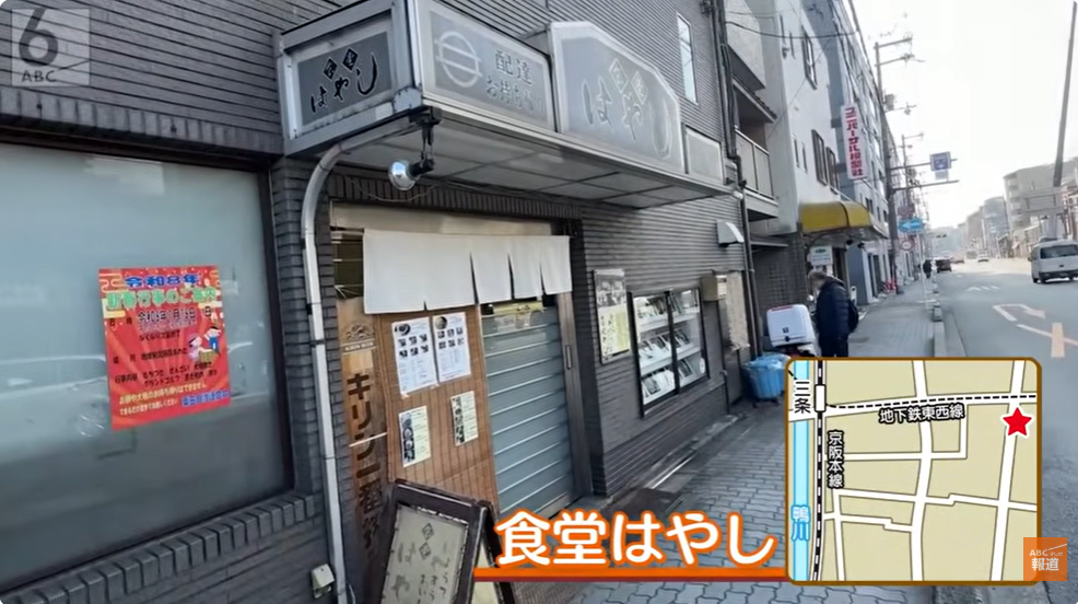 京都市東山区、京阪三条駅から徒歩およそ10分の「食堂はやし」は1953年創業。お客さんのほとんどが注文する看板メニューは、大きなトンカツが2枚も入ったトンカツ定食。自家製の甘みソースがたっぷりとかかった定番トンカツのほか、味噌トンカツ、おろしトンカツ、ごまトンカツと味は4種類もあります。