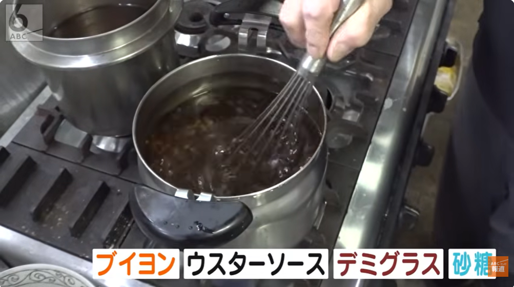 朝の仕込みのメインは、トンカツはもちろんハンバーグ、フライなどにもかける自慢の「ソース」。ブイヨンにデミグラスソースなどを独自にブレンドした自家製で、毎朝継ぎ足しながら作ることで、よりコク深いソースになるそうです。