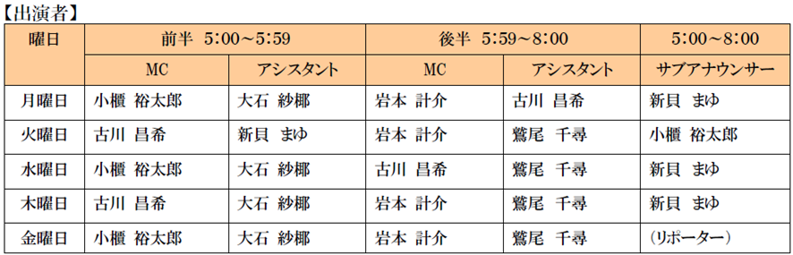 アナウンサー :岩本計介、古川昌希、鷲尾千尋、小櫃裕太郎、大石紗椰、新貝まゆ