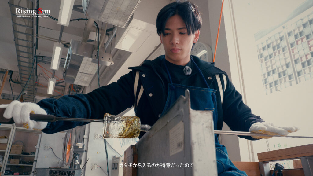 次に訪れたのは、琉球ガラス細工体験。「何か作るってなったら、できる限りこだわりたいのに、時間だけかけて納得いかず終わることが多いんです。でも、ダンスとか歌は納得いくまでできるので、自分に合ってると思います。昔から、真似するのが得意だった。歌もダンスも形から入るのが得意で、全てのスタートは真似からでした」とその原点を振り返る。