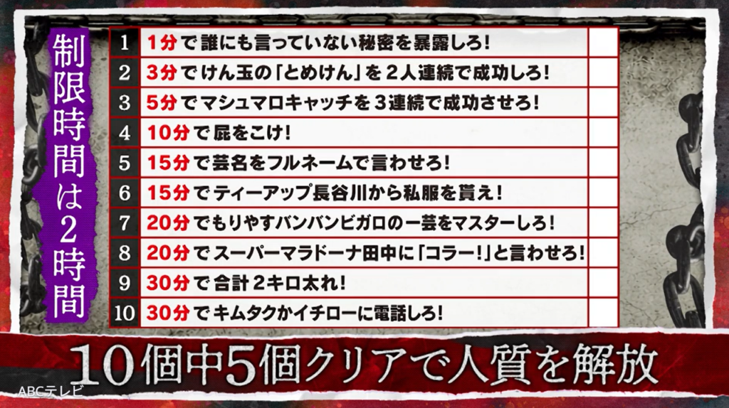 しかし、あまりにも無理難題すぎるためにミッションは失敗! その直後にたくろうの目の前で、ねんどは電流のようなものを全身に浴び、目を開けたまま動かなくなった……。無情にもさらにジグロウは、たくろうへ宗安聖の命をかけた新たな10個のミッションを指示。ラインナップは上記の通りで、たくろうは制限時間2時間以内に10個中5個クリアしなければならない。