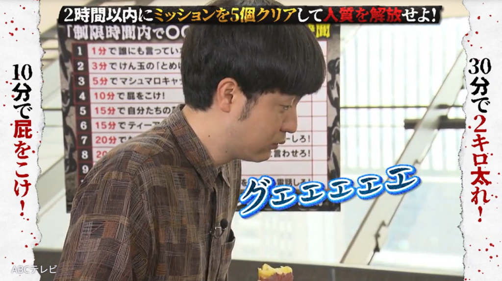 たくろうはさらにサツマイモを食べたが、出るのは残念ながらゲップのみ。そんな中できむらが、「ちょっと待って待って。ホンマに出る!」と期待する一幕が! しかし、「あっウ〇コ出る。危ない!」とのことで、たくろうは結局どちらのミッションもクリアできないままタイムアップを迎えた。