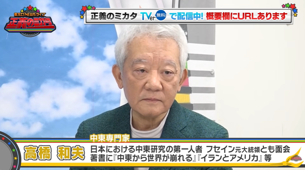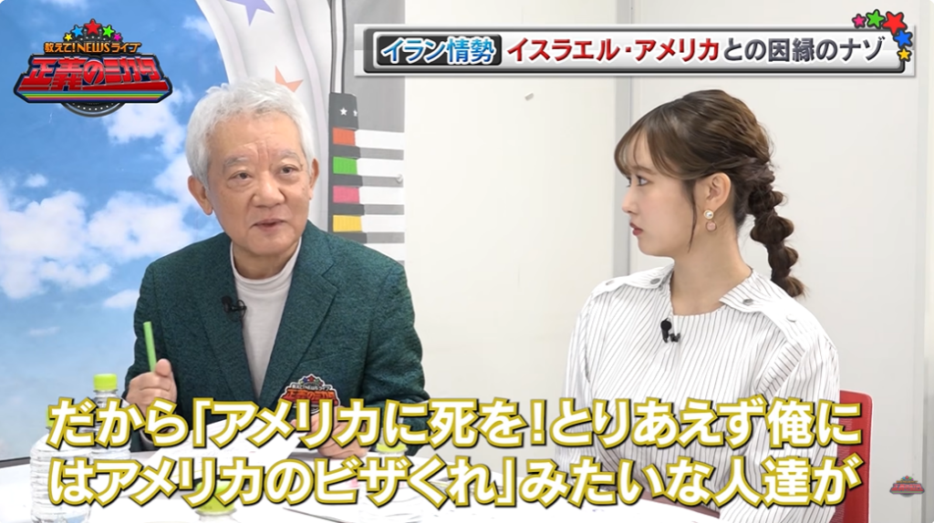 続けて、イスラエルとイランが険悪な理由について「結構これも複雑でね。イスラエルとイラン、実は革命後もうまくやってたときもあったんですよ。(元イラク大統領の)サダム・フセインの力が強いときは、フセインが共通の敵だから、イラン・イラク戦争のときにこそ~っとイスラエルがイランに武器売ってたりしてたんですよ。そのイラクの独裁者をアメリカが潰しちゃったから、もうイスラエルは怖いものはないというんで、イランと直接向かい合うようになった」と、7日の放送では語られなかった背景を説明した。