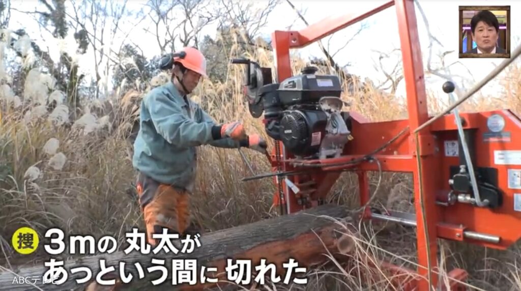 現在は、ガレージハウス前の街を見下ろすウッドデッキに、大ヒノキ風呂を作るために奮闘中。住居から50メートルの場所にある五右衛門風呂が不便だという妻のリクエストで、家の前に風呂を作っているのだそう。材料となるヒノキは、300万円もの製材機を購入して、原木から切り出している。