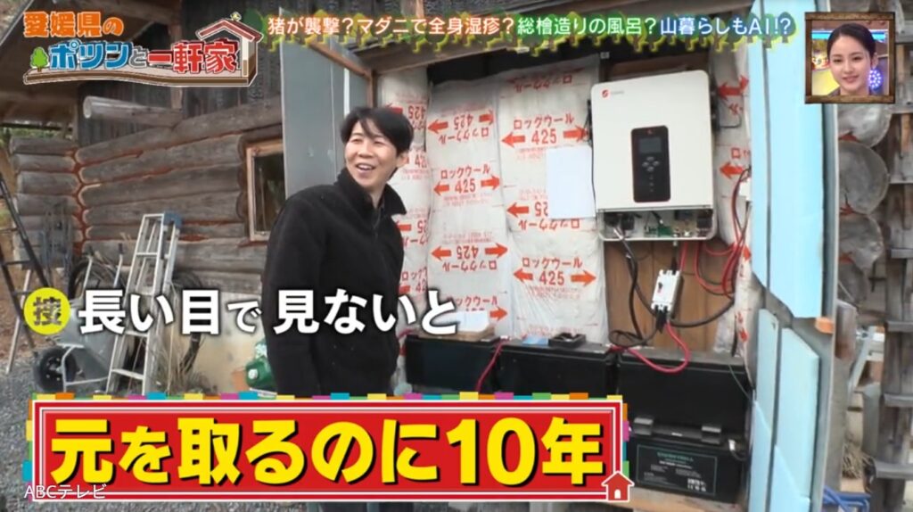 3年前に引っ越したというガレージハウスにも訪問。ガレージとして建てていたために、玄関を開けるとすぐにトイレという斬新な間取りになっている。電力は、四国電力と屋根に載せたソーラーパネルの電力をハイブリッドインバーターで使用。夏の電気料金は基本料金のみになるが、導入に140万円もかかった。