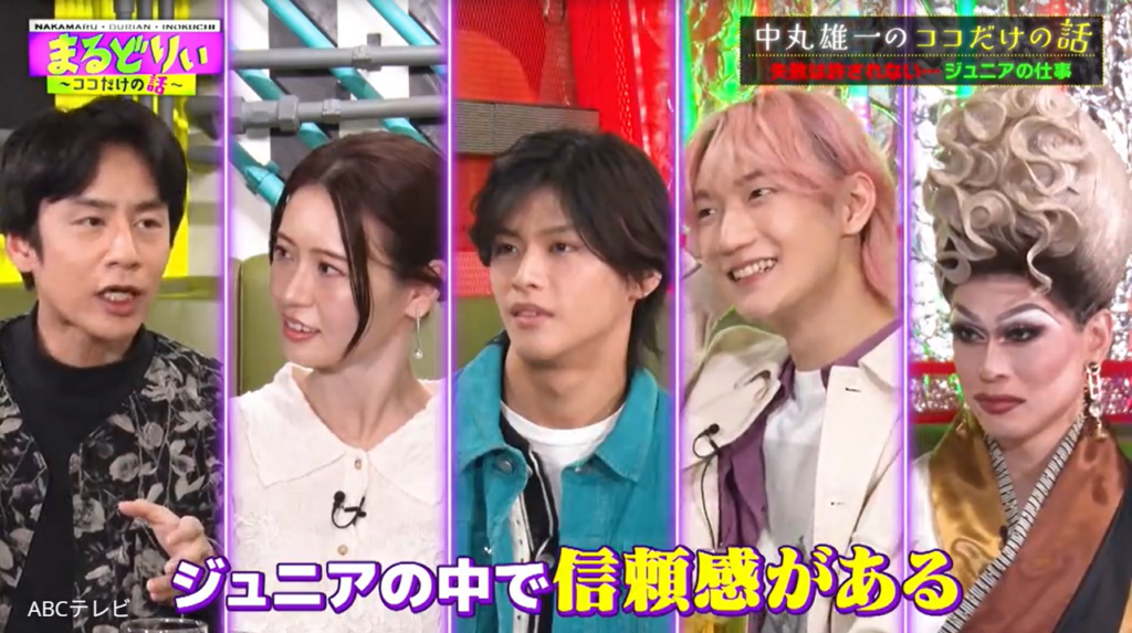 当時の心境について中丸は、「涙が出るほどホッとした」と回顧。そして、「たかが衣装を補助する役と思うと思うんですが」と切り出し、「ジュニアの中で信頼感があるというか、こいつには任せられるという評価がないと任せてもらえないんですよ」と、STARTO社所属でない共演者たちに説明した。