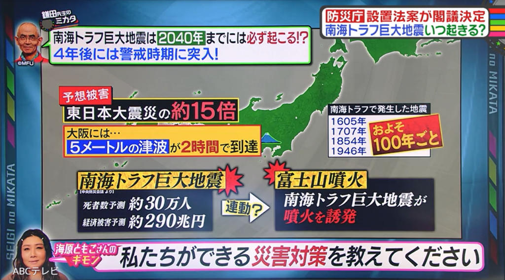 京都大学の名誉教授で地球科学者の鎌田浩毅氏によると、南海トラフ巨大地震は「2030年代に必ず起こる!」「4年後には警戒時期に突入!」とのこと。彼いわく、大阪には5メートルの津波が2時間で到着するらしい。予想被害は東日本大震災の約15倍で、死者数予測は約30万人、経済被害予測は約290兆円。この地震が、富士山の噴火を誘発する恐れもあるという。そのため鎌田氏は、防災庁の新設に期待している。