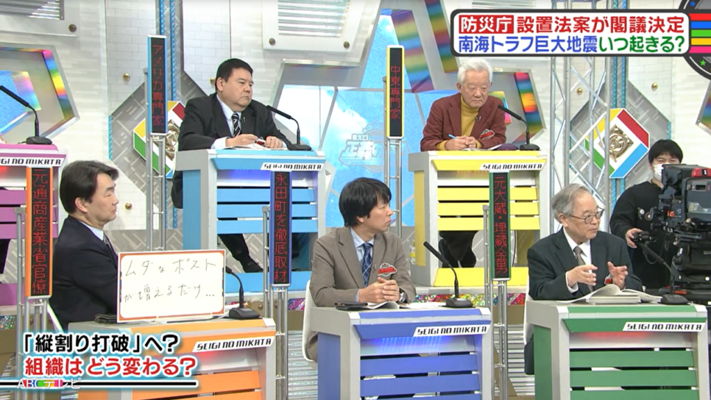 なお、新設予定の防災庁や南海トラフ巨大地震の想定被害などは、3月14日に生放送された情報バラエティ番組『教えて!ニュースライブ 正義のミカタ』(ABCテレビ)で取り上げられた。