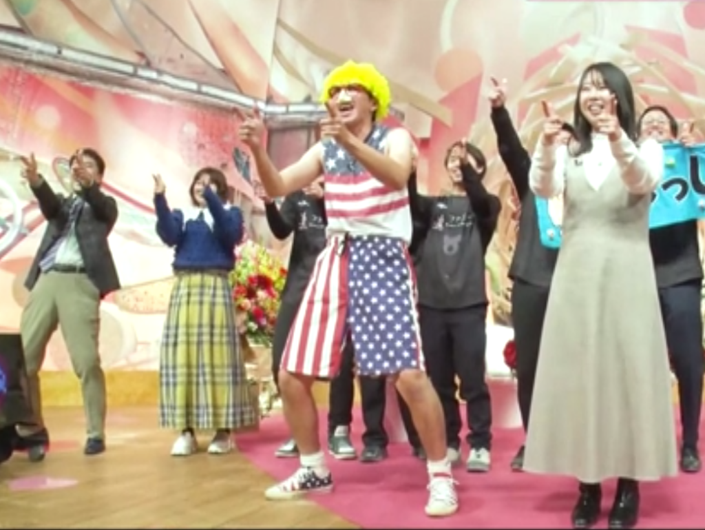 ということで「きっしー」に扮して登場してもらうと、夫の人格も豹変! アメリカ国旗の衣装に金髪パーマのいでたちで、ハイテンションキャラに早変わり…。