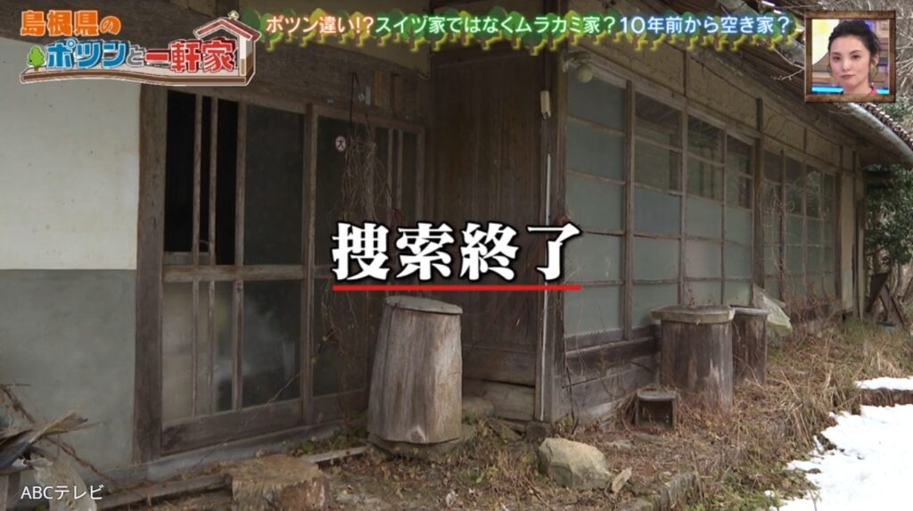 トンネルの先の集落で出会った男性にきいたところ、衛星写真の“ポツンと一軒家”は「空き家かもしれない」という情報を得た。教えてもらった雪の残る山道を進み、途中から車が通れない山道を30分歩いて現地へ行ってみた捜索隊は、目的の一軒家を発見。しかし、言われた通りの空き家だった。確認したところ、10年ほど前まで夫婦で住んでいたが、高齢になり麓の町へ引っ越したという。番組開始から20分。これにて、捜索終了――。