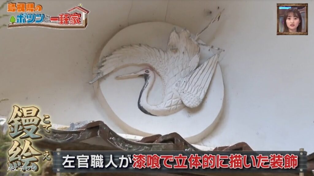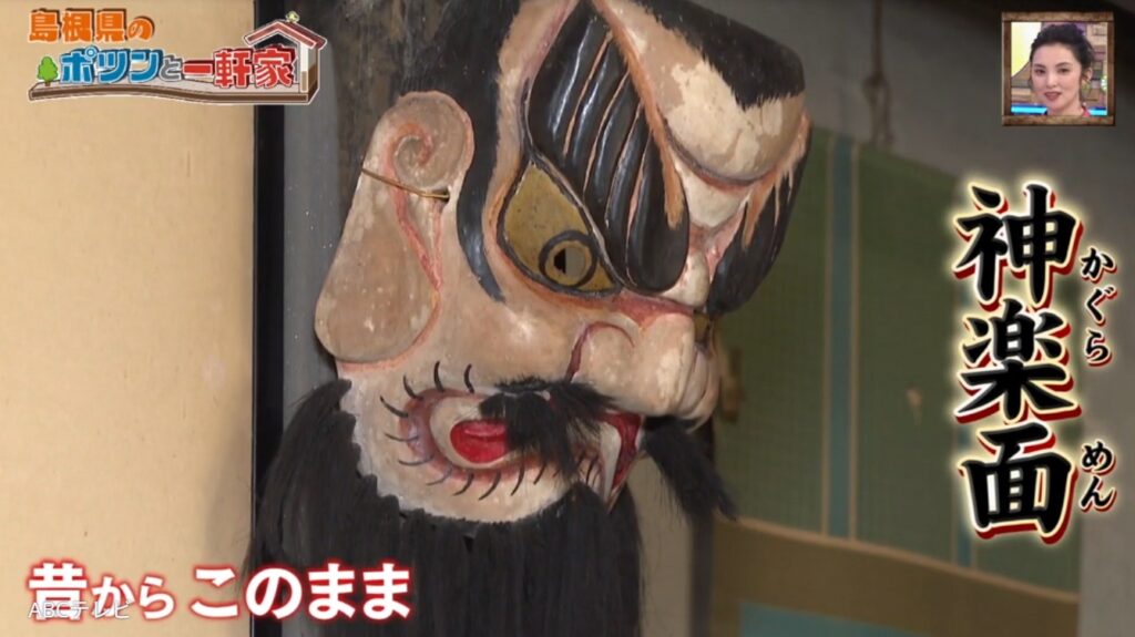 女性は現在、訪問介護の仕事をしながらこの“ポツンと一軒家”に一人で暮らしている。「終活中」と言う彼女は、立派な漆喰作りの鏝絵のある蔵や大きな納屋を自力で解体している。家の中を案内しながら、玄関では「おじいさんが電話の株券を買うて連絡所をしていたんです。電話が鳴ると『どこの家の人あてですか』ときいて呼びに行っとったんです。昭和50年くらいまでやっていましたね」、仏間では「ここで葬式をして」とこの家の歴史を語ってくれた。石見神楽の鬼の面もある。島根県西部・石見地方に伝わる日本神話を題材にし、日本遺産にも認定された伝統芸能で、父が舞っていたという。