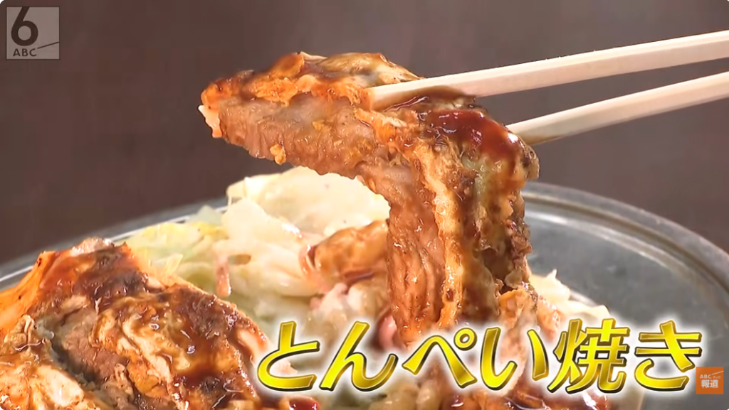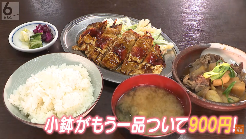 一番人気は「とんぺい焼き」。超肉厚の豚ロースをふわとろの卵で包み、創業時から受け継がれてきた甘辛い特製ソースをかけて仕上げます。「肉々しくておいしい」とお客さんも絶賛のとんぺい焼きが主役の「ここや定食」は、ご飯に味噌汁、さらに20種類以上から選べる日替わりの小鉢もついてなんと900円!抜群のコスパも人気の秘密です。