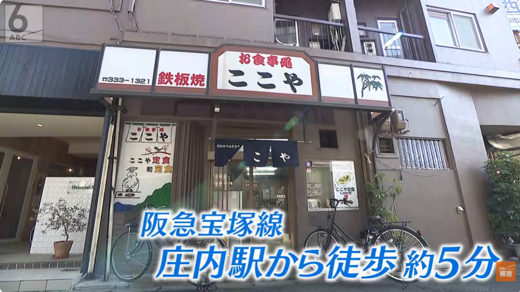 阪急・庄内駅から徒歩5分。下町の風情が残る商店街を抜け、その先の路地にある大衆食堂「ここや」は1969年創業。目の前の鉄板で焼き上げる、アツアツの鉄板焼きが名物のお店です。