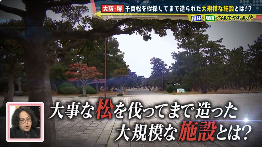菅原神社の関係者いわく千両松は、神社から約5km先の浜寺公園にあったもの。同公園は昔から、「松が有名なところ」だったそうだ。そこで塚田と福井アナは、調査のために浜寺公園へ向かった。