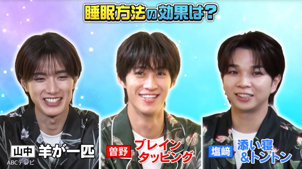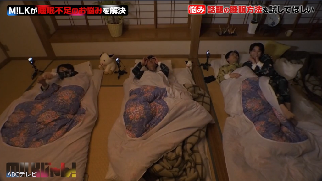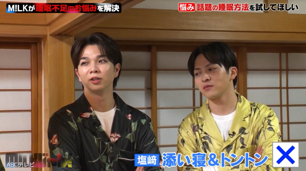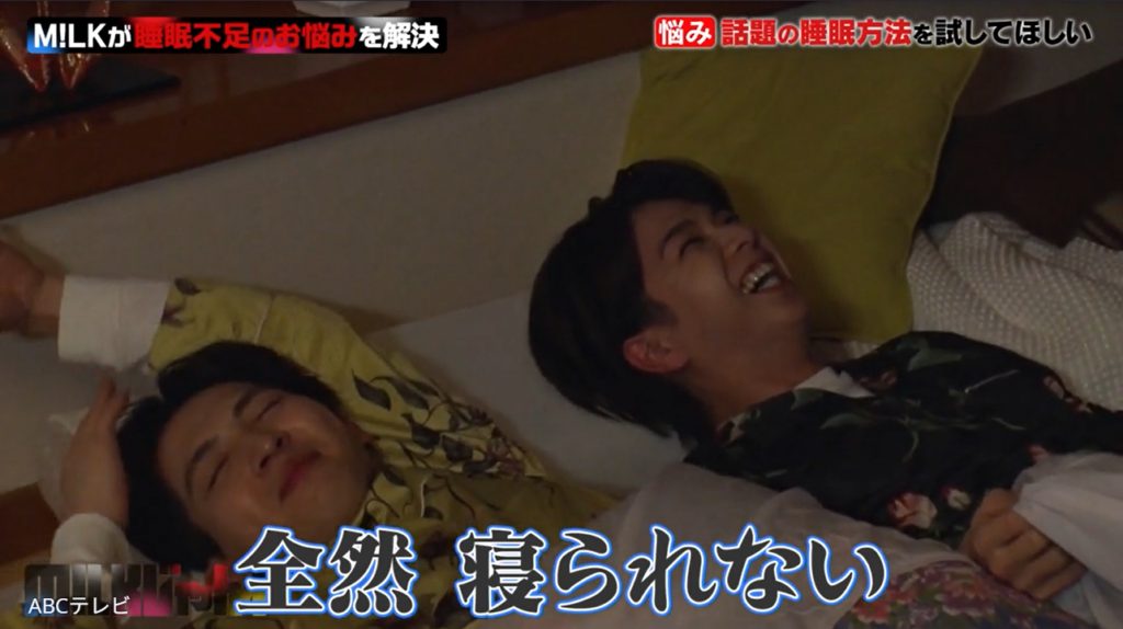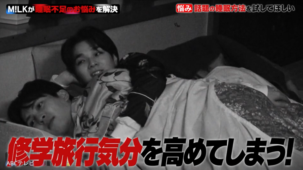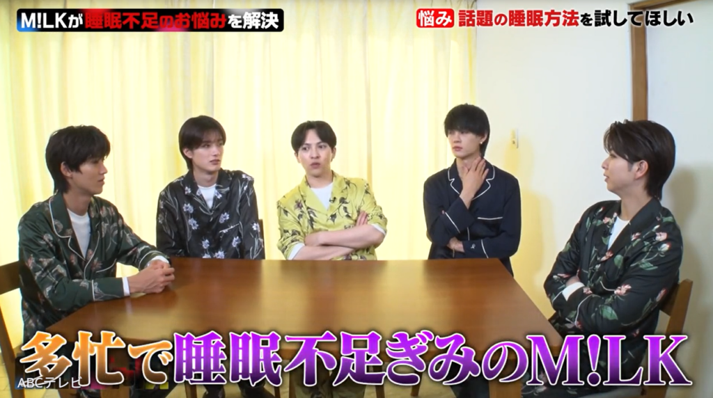 なお、M!LKのドタバタな睡眠法検証企画は、3月17日深夜に放送されたABCテレビ『M!LKじゃん!』で行われた。
