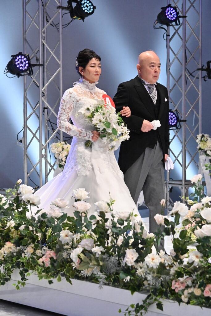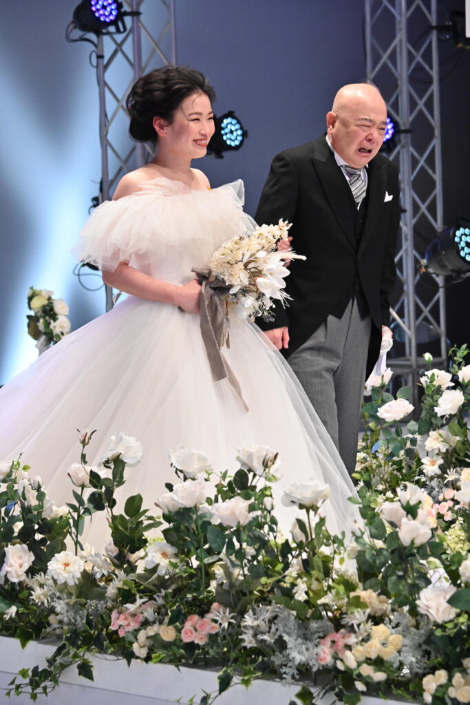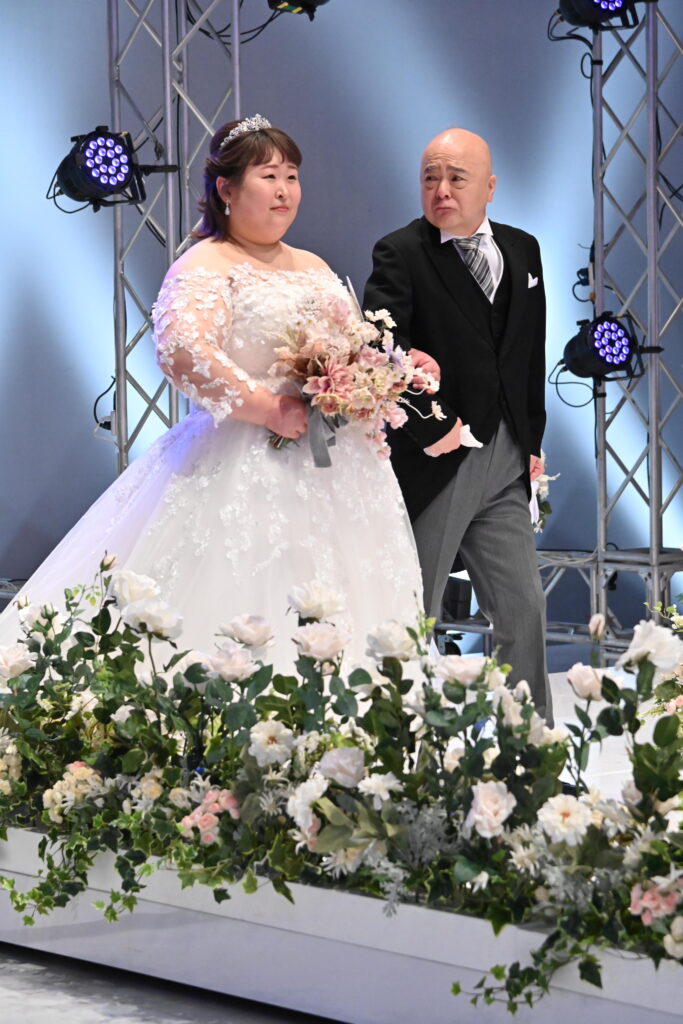 3人はそれぞれ、3時のヒロインかなで、ゆにばーすのはら、爛々(らんらん)の萌々(もも)を担当し、花嫁のヘアメイクを施された女性芸人たちは、父親役を演じる俳優、酒井敏也と並んでバージンロードを歩いた。