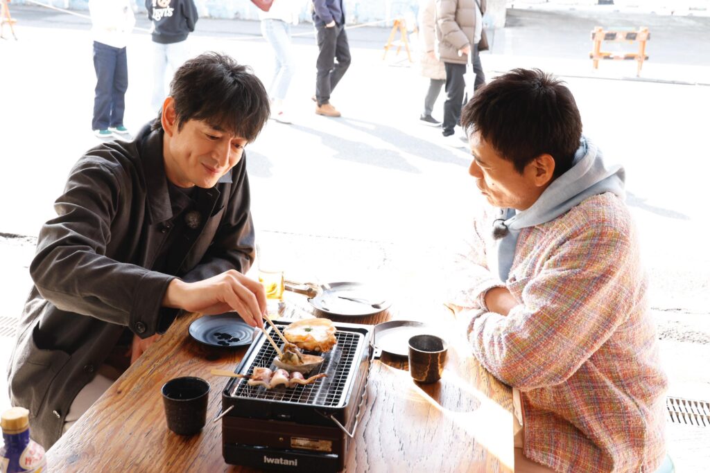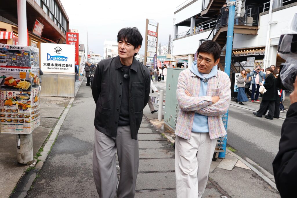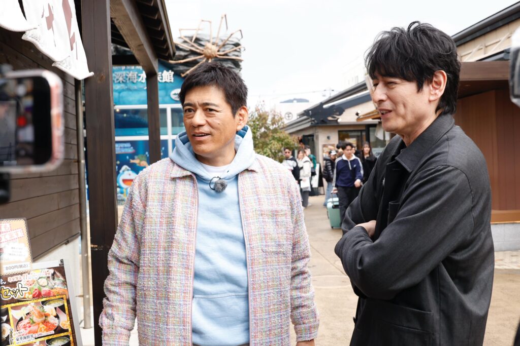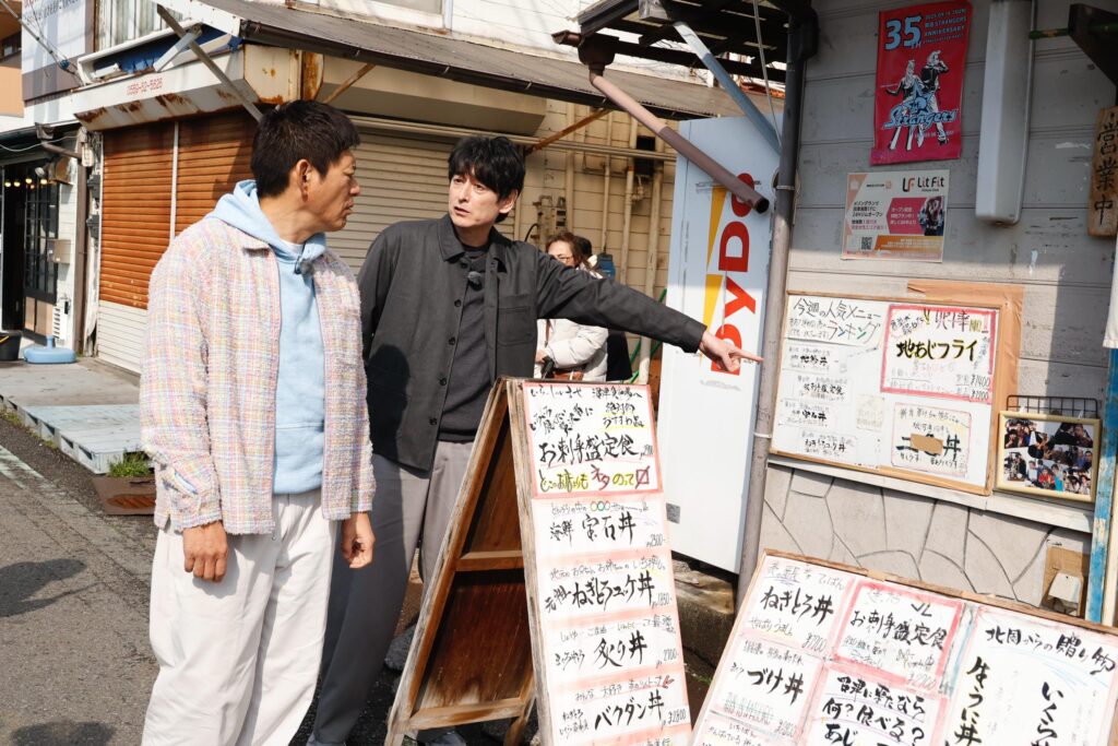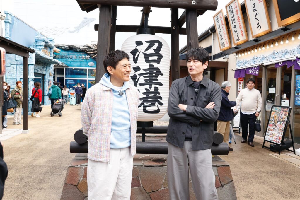 「沼津港深海水族館」を出発点に散策をスタート! 整備された歩行者道路の両脇に土産物店や飲食店がずらりと並ぶ光景を見て、「あーなんかすごい!」「観光地ですね、完全な」「選び放題やん」「浜焼きとかね」とおじさんたちがウキウキモードに。そして華丸が「ちょっと寒いんで、日本酒キュッとどうですか大吉さん」とお誘いすると、大吉が「断る理由はないですよ、私は」とまんざらでもないリアクション。先週のオンエアで、「わさび丼」と「わさびラーメン」という番組初登場の絶品丼麺をクリアしたからか、2人にはなんだか余裕が漂っている。