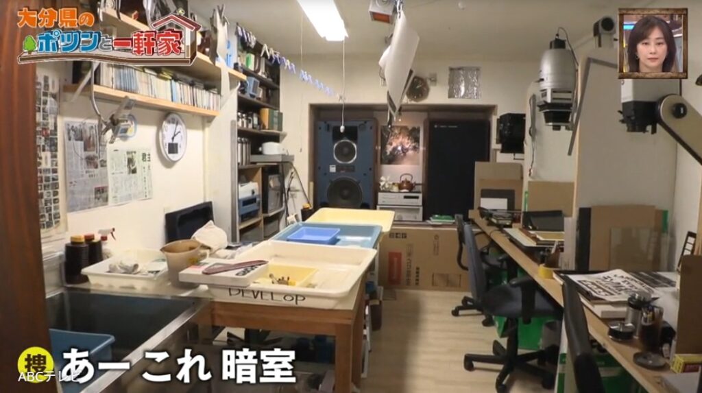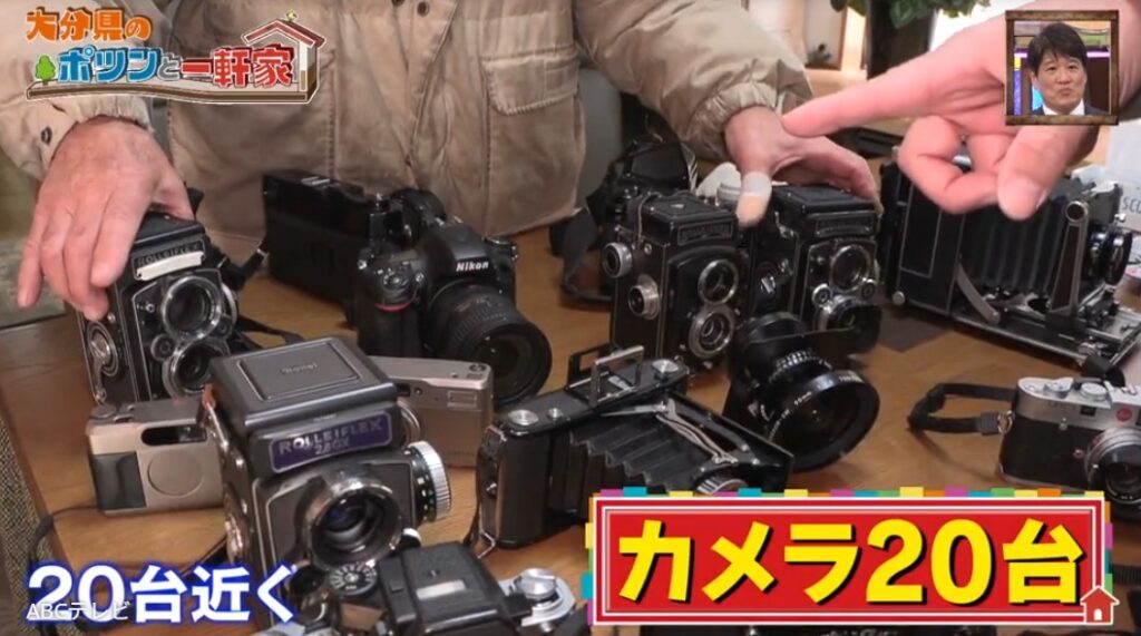 愛用のカメラは約20台。貴重なカメラの中には、100万円以上もするものも。自宅には写真の現像室もあり、地元の同好会や大分大学写真部もこの家に集うという。ご主人は捜索隊をモデルに二眼レフで撮った写真の現像過程を見せてくれた。