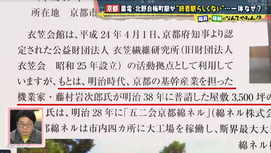 さらに衣笠会館自体も、もとは明治期に京都の基幹産業を担った機業家・藤村岩次郎氏の屋敷だったことが判明! 藤村氏はこの地域で住宅地開発も手掛けた実業家でもあったことから、塚田と福井アナは「藤村氏が地域を発展させたことで、白梅町駅に嵐電を引き込んだのでは」と推理した。