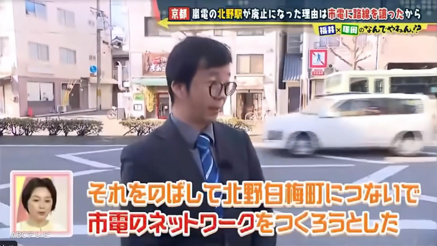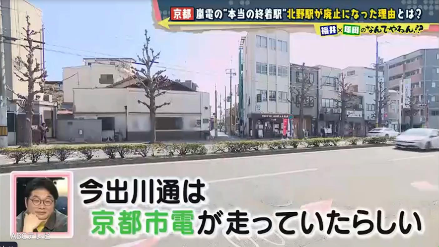 思わぬどんでん返しを受け、2人は消えた北野駅の跡を探すことに。今出川通沿いで46年間お好み焼き店を営むベテラン女性から、かつてこの周辺には市電と嵐電がそれぞれ別の道を走っていたという貴重な証言を得る。その話を手掛かりに道をたどると、線路が延びていても不思議ではないような地形や、不自然に広く空いたスペースが見えてきた。