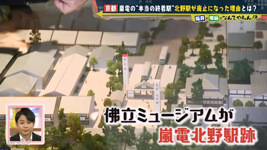 さらに調査を進めたNDYの二人は、近くの「京都佛立ミュージアム」へ。すると館内には、嵐電が走っていた昭和30年ごろの街並みを再現したジオラマが展示されており、現在ミュージアムが建つ場所こそが、かつての北野駅だったと判明する。