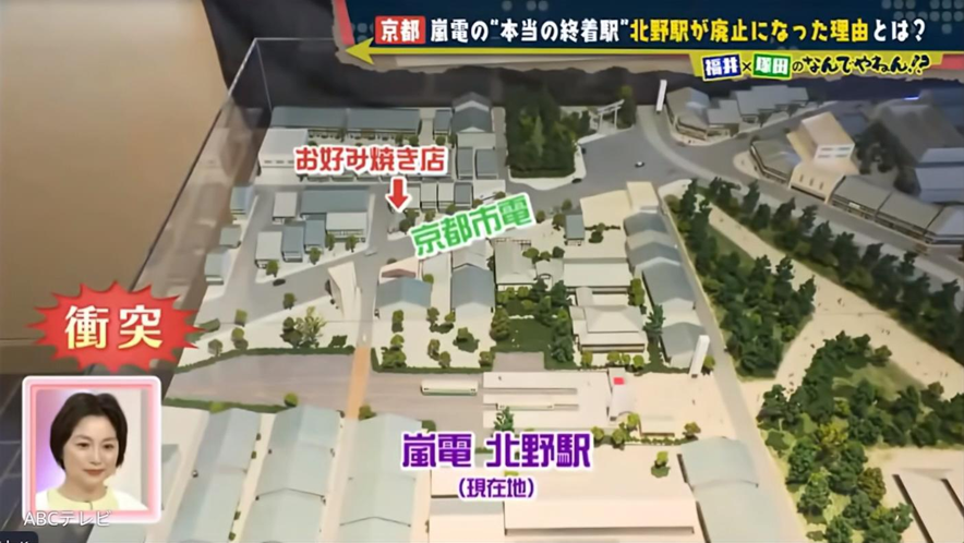 では、なぜ北野駅は姿を消したのか? お好み焼き店の女性の証言やジオラマの線路配置から考えると、後に整備された京都市電が北野天満宮方面と西大路通を結ぶために延びてきたことで、嵐電の線路と干渉する形になった可能性が見えてきた。