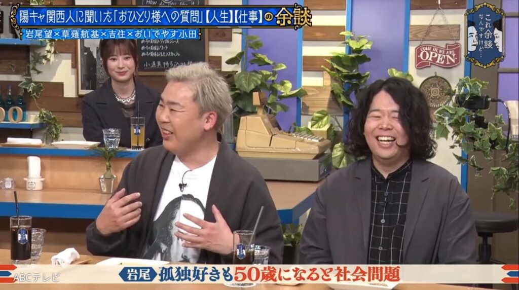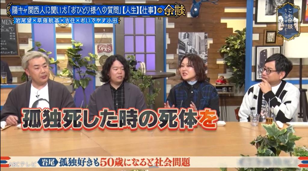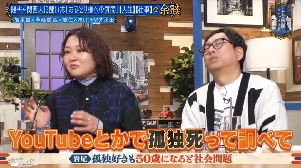 お笑いコンビ・フットボールアワーの岩尾望は、50歳になるまで1人の時間を謳歌してきた。しかし、社会問題である単身高齢者に自分がいざ近づいてきて、「おひとり様じゃなくて独居老人というか。そっちにスライドしていく感じがあるから、その怖さは若干ある」という。