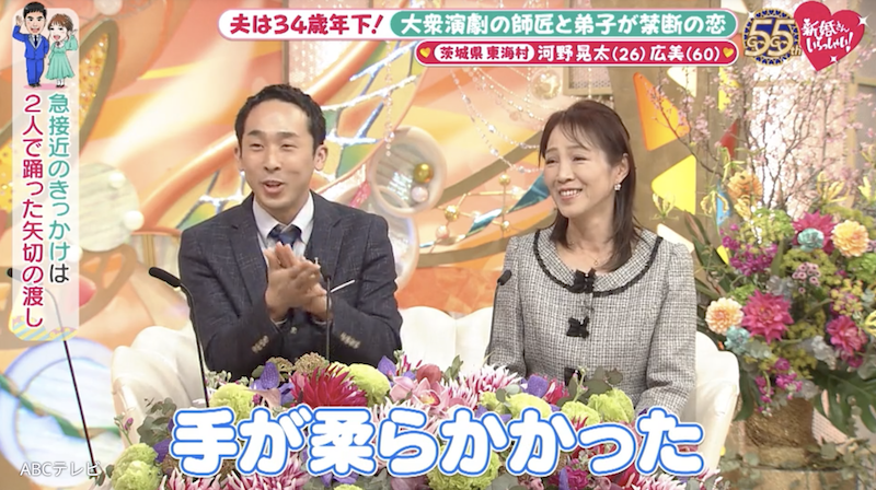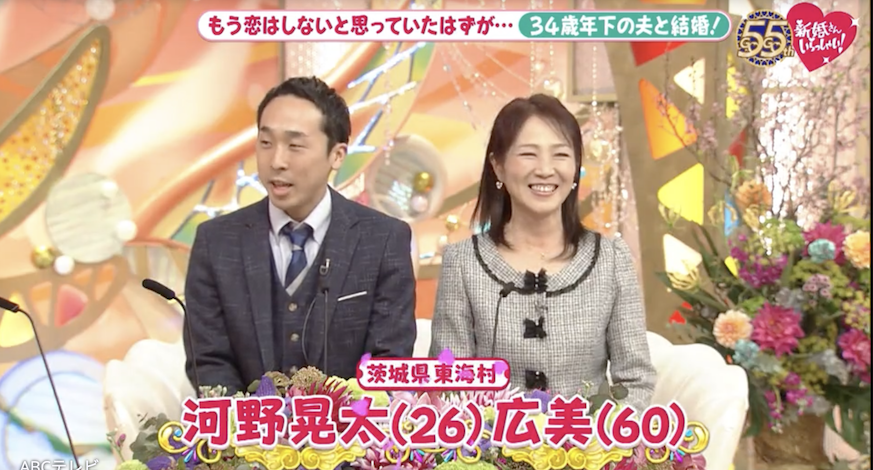 4月5日放送の『新婚さんいらっしゃい!』に、夫・26歳、妻・60歳という新婚さんが登場。茨城県東海村で34歳差の愛を育むカップルだ。