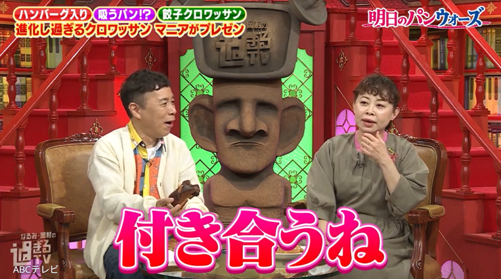 吉岡の熱視線に気づいていないのか、岡村は「何このパリパリ感!」「チョコレートと中のオレンジのすっぱさがマッチしてすんごい良い感じ!」と食リポ。自分が推すパンをおいしそうに味わってくれた岡村に、吉岡は喜びながら熱視線を向け続け、「外ザクザク、中がちょっとしっとりしていて……」と解説した。