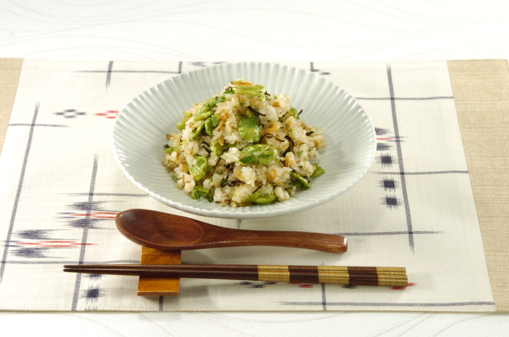 この日のテーマは「今が旬!そら豆」。そら豆と桜えびの彩りもやさしい春のご飯メニュー「そら豆と桜エビの炒め飯」を辻調理師専門学校の簾達也先生から教わった。