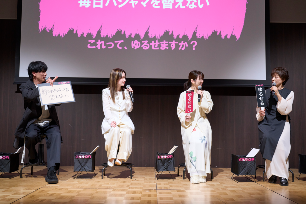 新ドラマ『エラー』は、人の過ちをどこまで赦(ゆる)せるかが見所の1つ。それにちなみ、「世間は気にしてないみたいだけれど、自分はどうしてもゆるせない」お題を出し合うチーム対抗のゲームコーナも設けられ、藤井が「毎日パジャマを着替えないのはゆるせない。ツアーに行くときは、パジャマでキャリーがパンパンになる」と力説してコーナーを盛り上げました。勝利した「チーム未央」リーダーの志田は、「登壇キャストに何でもゆるしてもらえる権利」を獲得。「セリフを間違えたとき現場がシンとするから、『大丈夫だよ!』と励ましてほしい」とリクエスト。