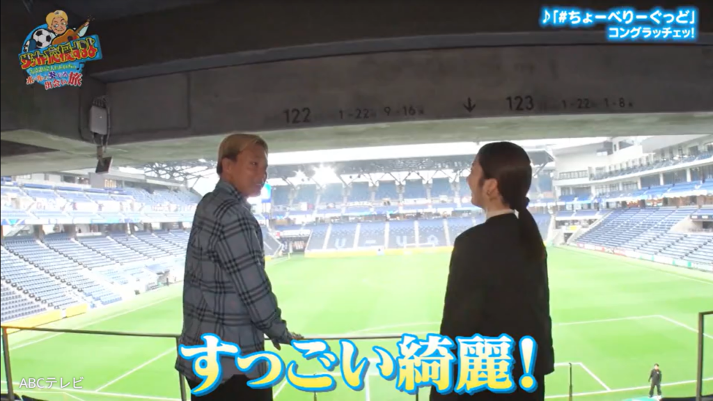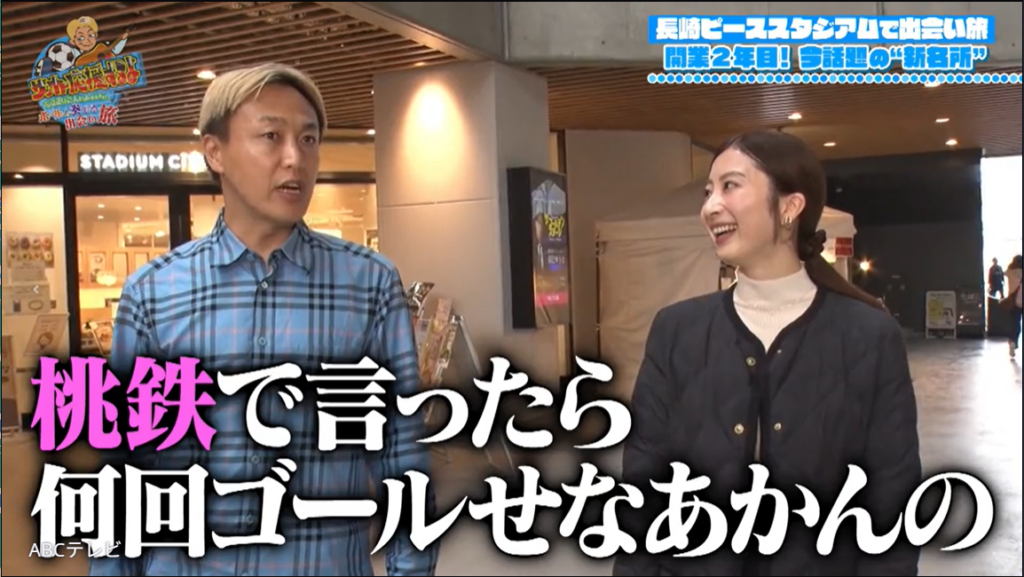 スタジアムの中には、なんとマツモトキヨシやスターバックスの店舗が。「ここは何ですの!?」と驚くしんいち。実はピースタを擁する「長崎スタジアムシティ」は、サッカースタジアムを囲んで、試合も観戦できるホテル、アリーナ、商業施設、オフィスが併設されている大型複合施設なのだ。さらにはスーパーマーケットや24時間営業のスポーツジム、天然温泉まであり、しんいちは「サッカーの試合がない日も、ここに来たら楽しいよっていう街ですね」と感心する。