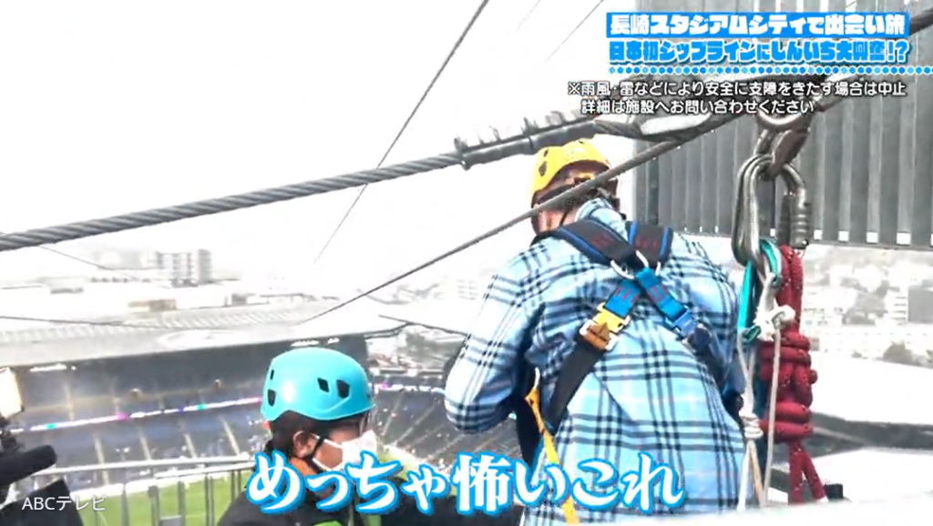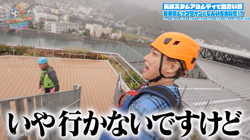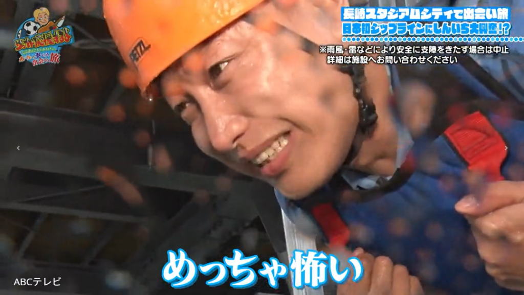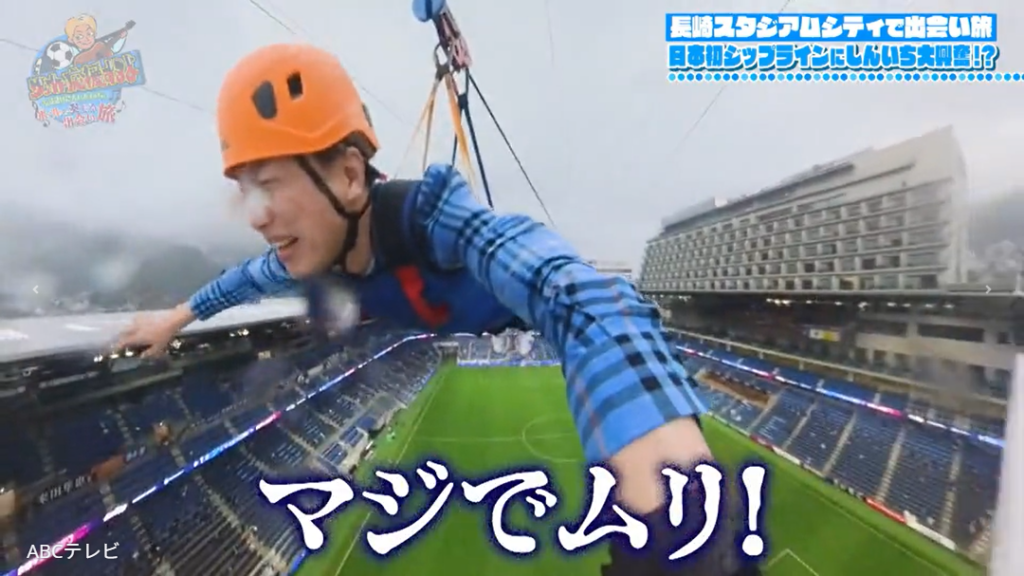この日の長崎は、あいにくの雨。だが、しんいちは「これ、サッカー関係あんのかなあ!」とぶつぶつ文句を言いながらも、スタンバイする。そして、宙づりになった状態からジップラインがスタート! 「怖い、怖い、怖い!」「ヤバイヤバイヤバイ!!」「ムリムリムリ!!!」と、雨のスタジアムにしんいちの絶叫が響き渡る!!