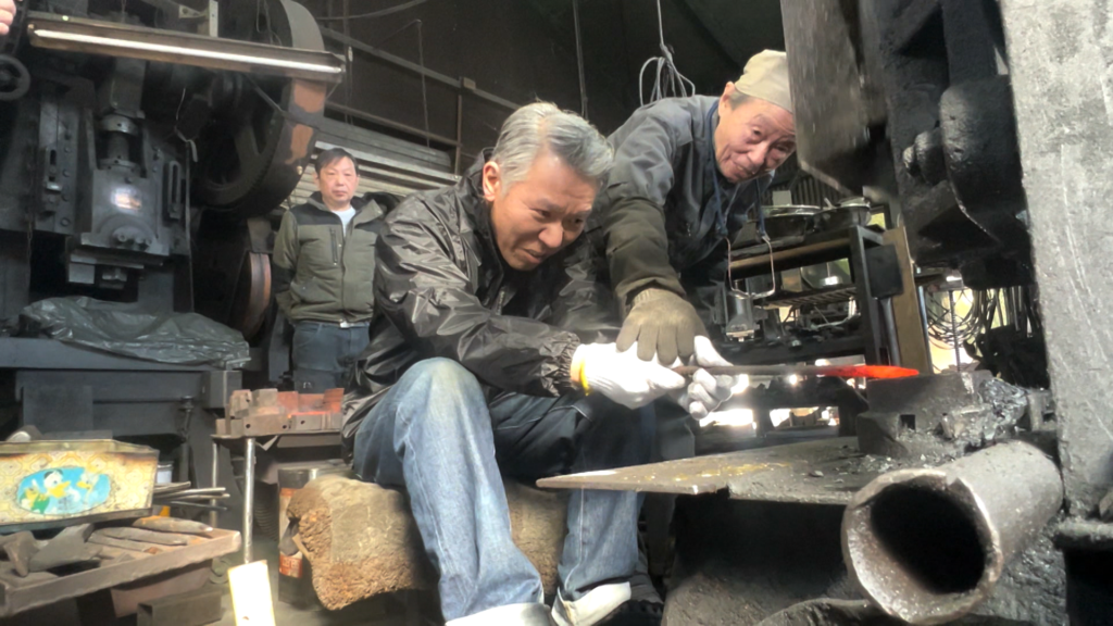 燕三条地域の名物グルメ、燕背脂ラーメンの人気店で腹ごしらえし、工業団地へ。斧とまさかりが専門の工場にお邪魔し、火と鉄、鋼を巧みに操る伝統工芸士のダイナミックな職人技を拝見。西森も勧められるままに鍛造機械のスプリングハンマーを体験し、モノづくり芸人の本領を発揮する。