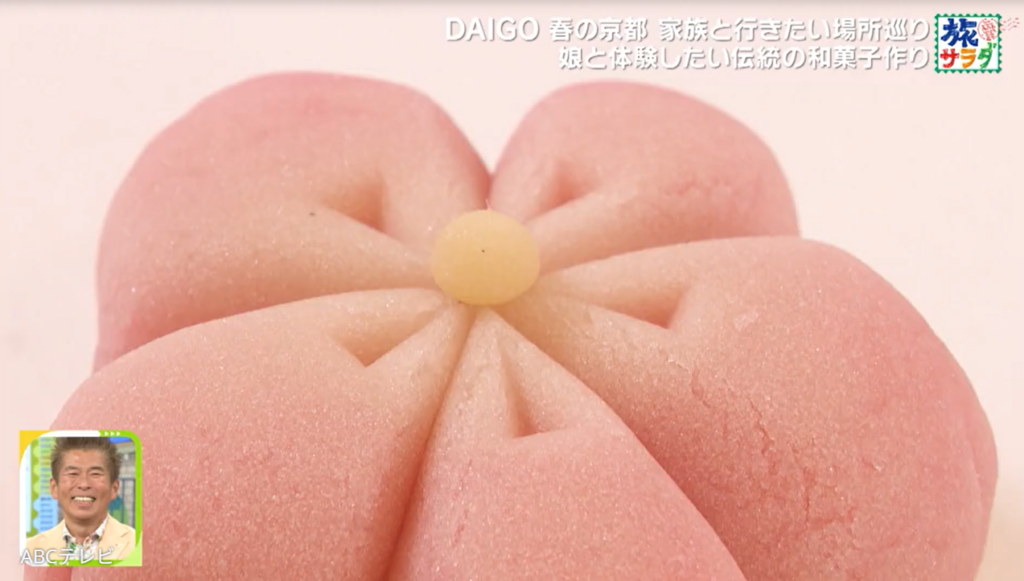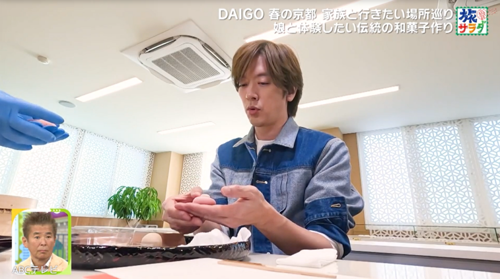 「最近料理を手伝ってくれる5歳の長女を連れて行きたい」ということで、DAIGOは和菓子の老舗・亀屋良長 京都本店へ。和菓子の手作り体験ができる同店で、DAIGOは娘にかっこいい姿を見せるべく、練りきりで桜を作る練習をした。