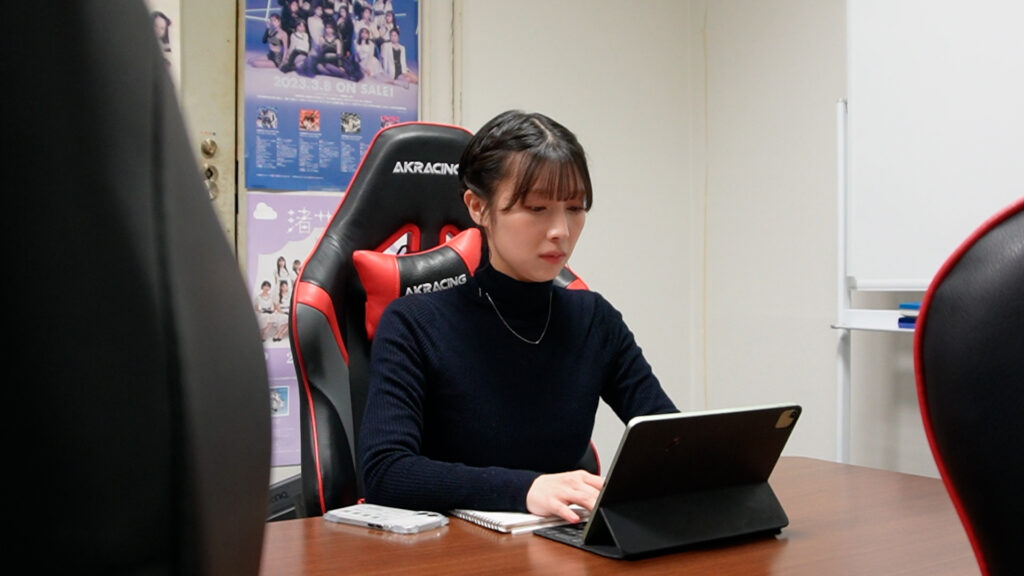 誰もいない打ち合わせ室で小説を書く若菜さん。デビュー作の「アイドル失格」は、現役アイドルとファンとの禁断の関係を描いて大きな注目を集めました。アイドルが抱える不安や悩みをリアルに描写し、若菜さんだからこそできる表現が散りばめられています。続く二作目の「私の居場所はここじゃない」では、理想と現実の狭間で揺れる高校生たちの心の葛藤を鮮やかに描きました。
