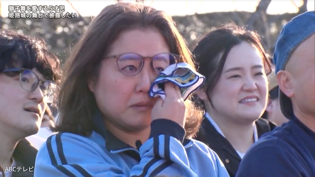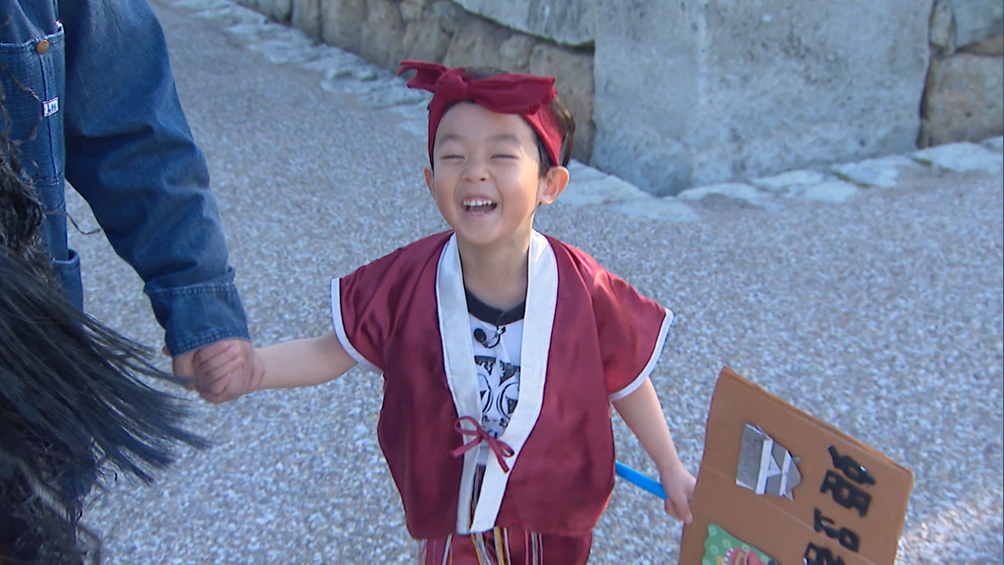 4時間の猛特訓を終えて姫路城へ移動したハロ君を出迎えたのは、内緒で集合したこども園のお友だちや、両親と弟さん、そして両家の祖父母たち。サプライズに緊張感が強まるが、「獅子舞やるので見てください!」と元気に宣言!