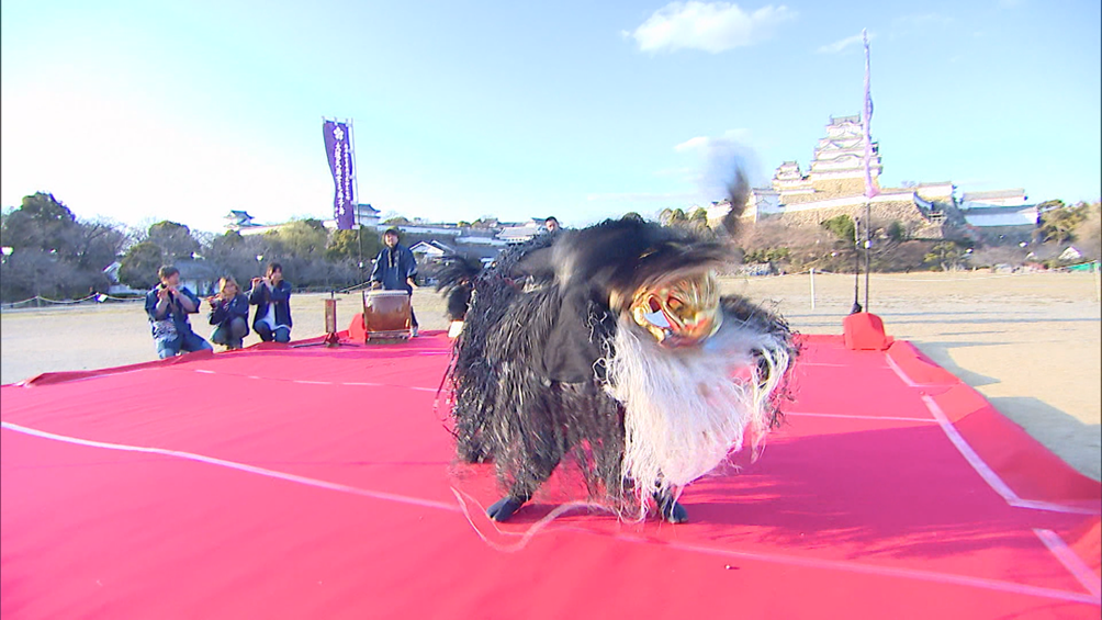 「よっしゃいくぞ」と気合を入れて、青年団のみなさんと共に獅子舞に挑む。姫路城を背負い、獅子になった息子の勇姿を目撃し、依頼者の目に涙が……。