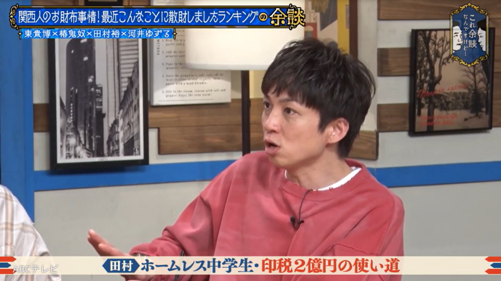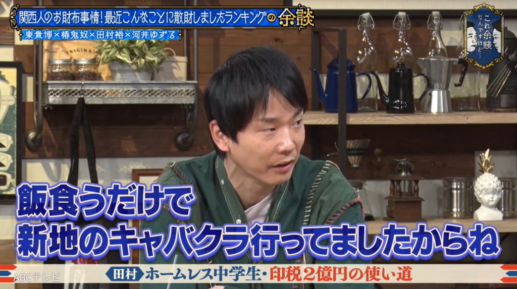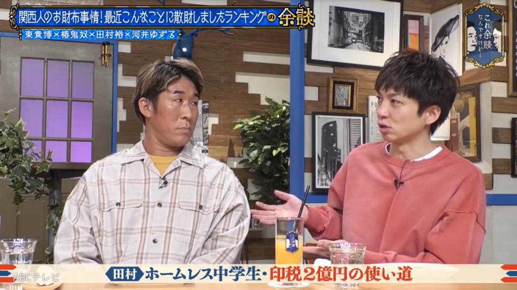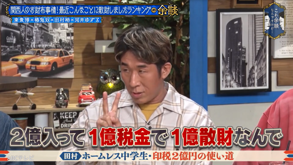 東貴博&椿鬼奴の“実家金持ち芸人”と、田村&河井ゆずる(アインシュタイン)の“実家貧乏芸人”が出演した「これ余談なんですけど・・・」で“散財”がテーマのトークになると、田村は「『ホームレス中学生』のお金は、「もう大いに使わせていただいた。印税で2億入って、1億税金で1億散財」と当時を振り返った。
