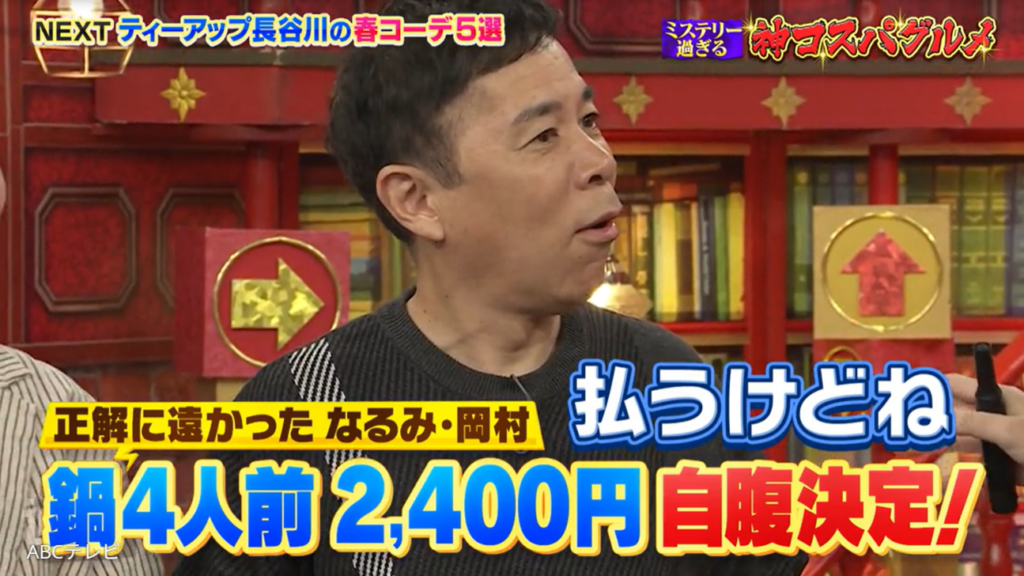 予想を外した岡村&なるみの自腹が決まったが、想像を超える神コスパに岡村も「払うけどね」と笑ってしまう。