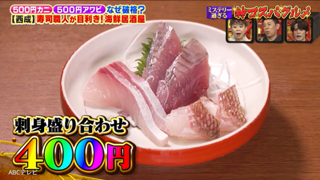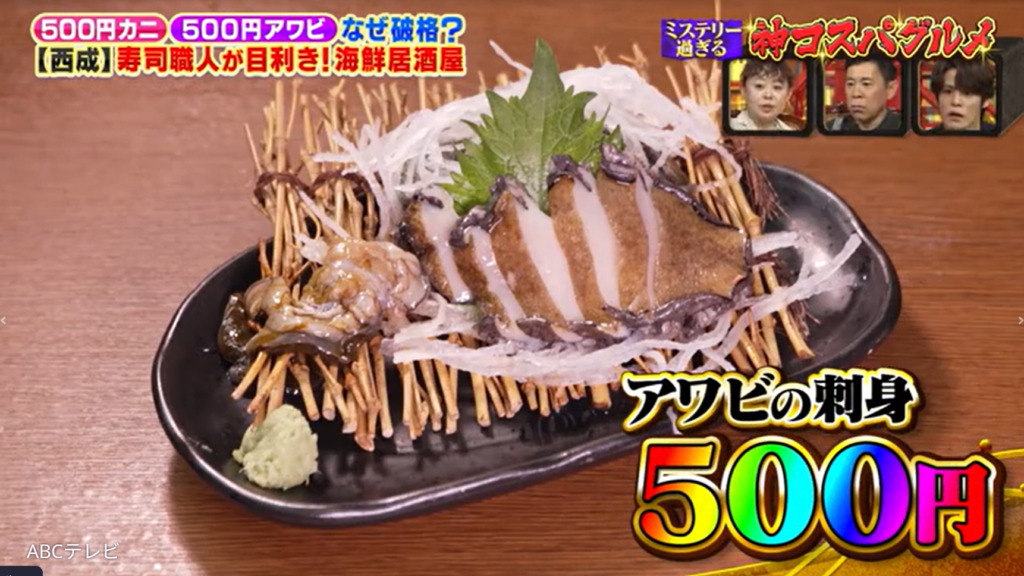 「居酒屋いろは」は、40年以上の寿司職人歴をもつ店主が切り盛りする情緒あふれるお店。新鮮な食材を活かした料理はどれも絶品で、なおかつ神コスパ。新鮮な刺身盛り合わせはなんと400円で、アワビの刺身は500円、ズワイガニも1杯500円と高級食材ですら西成価格だった。