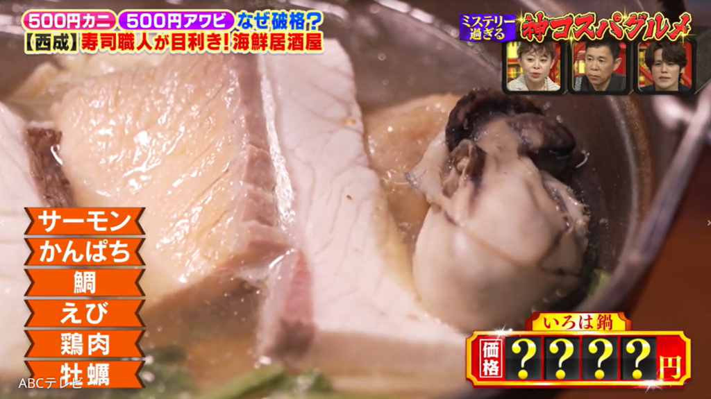 お店で最も高額なメニューだという「いろは鍋」は、愛媛県産の真鯛や兵庫県赤穂産の牡蠣をはじめ、豪華な食材が惜しげもなく盛り込まれている。お客さんの半数がオーダーするという鍋は果たしていくらなのか、岡村&なるみチームと、声優・俳優の宮野真守&WEST.の神山智洋チームに分かれ、価格当てに挑戦することになった。