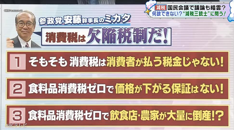 これに安藤氏は「分かってないから言ってるんですよ、食料品だけ消費税ゼロなんて」とぶっちゃけ。制度が複雑すぎて、国会議員でもほとんどの人が理解していないと指摘した。
