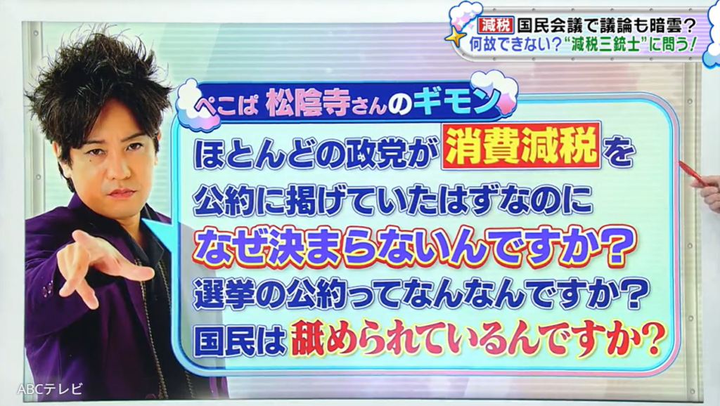 消費減税をめぐる議論が停滞する中、タレントのほんこんが「なんで国会で言ってくれへんのかな」と怒りをあらわにする場面があった。公約として掲げられていたにもかかわらず進まない現状に、スタジオでも疑問の声が上がる中での発言だった。