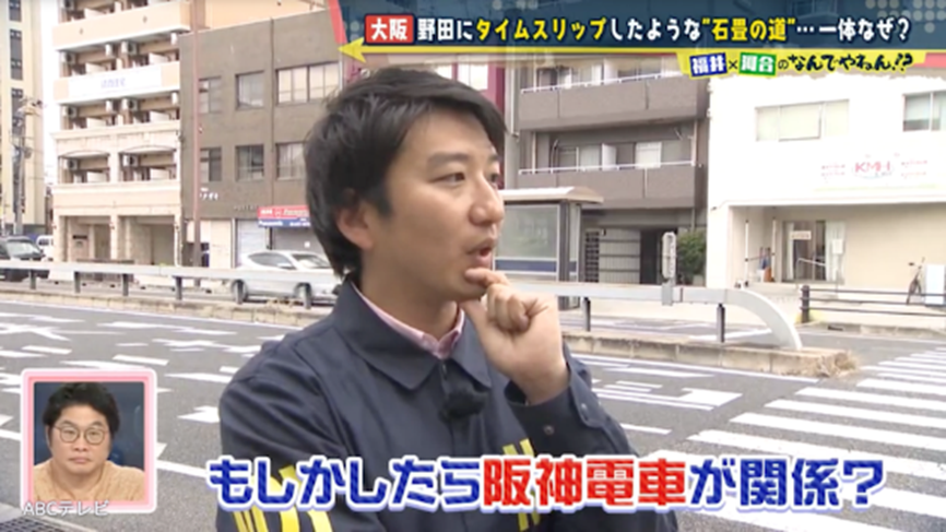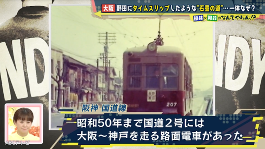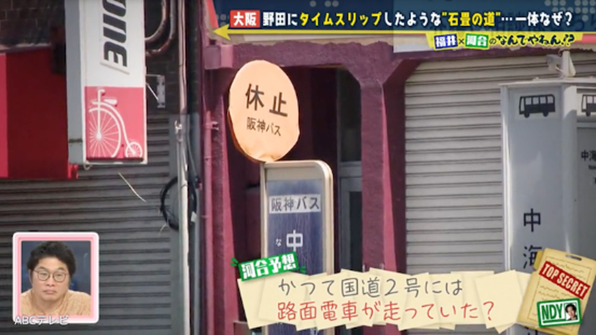 石畳の通りを抜けた国道沿いで、阪神バスの停留所を発見した河合は「昔、路面電車とか通っていた可能性はあるよね」と推測。この石畳は、阪神電鉄と何か関係があるのだろうか?
