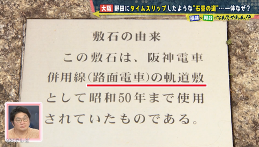 石碑に刻まれた『この敷石は、阪神電車併用線(路面電車)の軌道敷として昭和50年まで使用されていたものである』という文字!