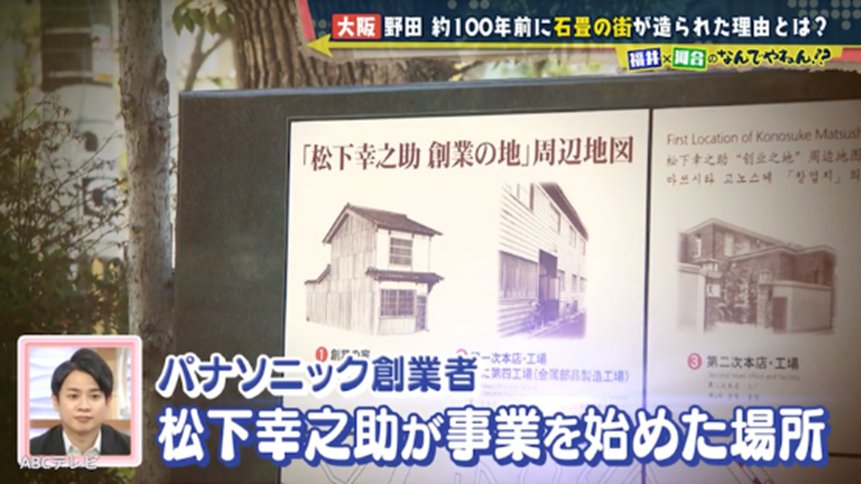 この街が、松下電器(現・パナソニック)の創業者、松下幸之助が最初に事業を始めた場所である、という事実! このことから「この石畳の街は、松下幸之助が築いた“松下シティ”だったのではないか?」という結論にたどり着いたのだった。